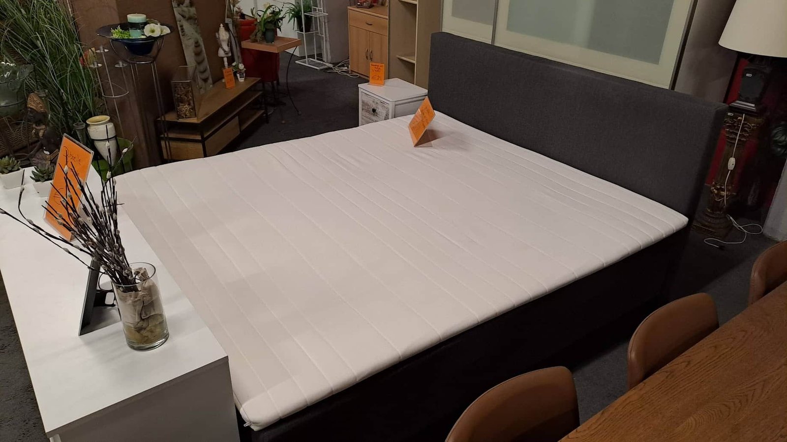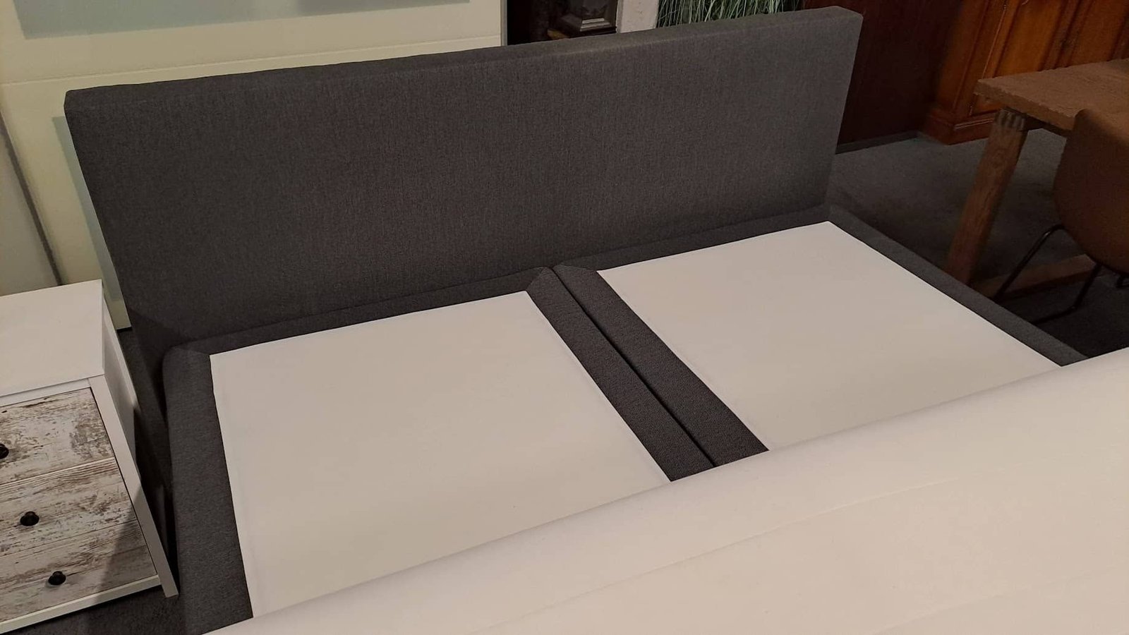 Bedbodem in grijze stof met matras, topmatras en hoofdbord