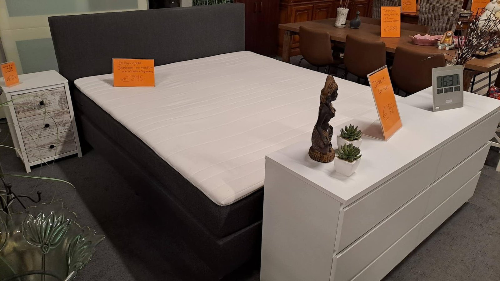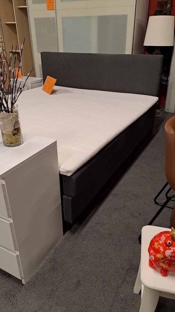Stijlvol tweepersoons bedbodem in grijze stof, inclusief, matras én topmatras. Het zachte hoofdbord zorgt voor extra comfort en een moderne uitstraling.