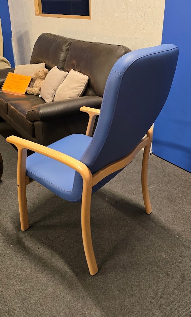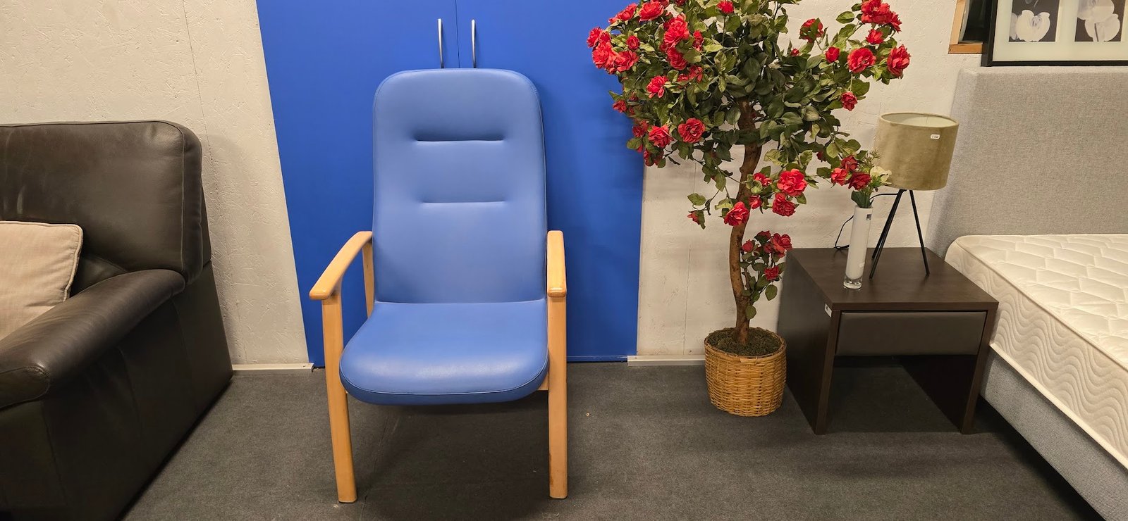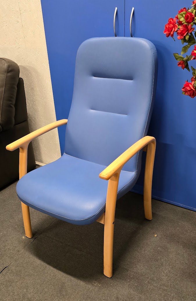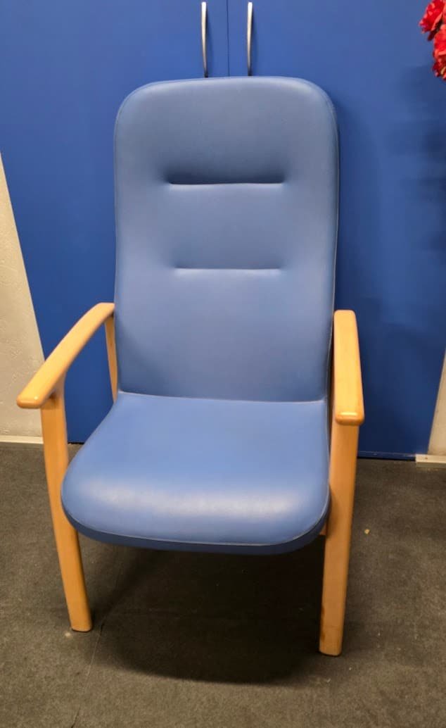 Deze stevige zorgzetel met hoge rug en houten armleuningen biedt comfortabele ondersteuning. De blauwe bekleding is volledig afwasbaar, waardoor de stoel ideaal is voor zorginstellingen, wachtruimtes of thuisgebruik.