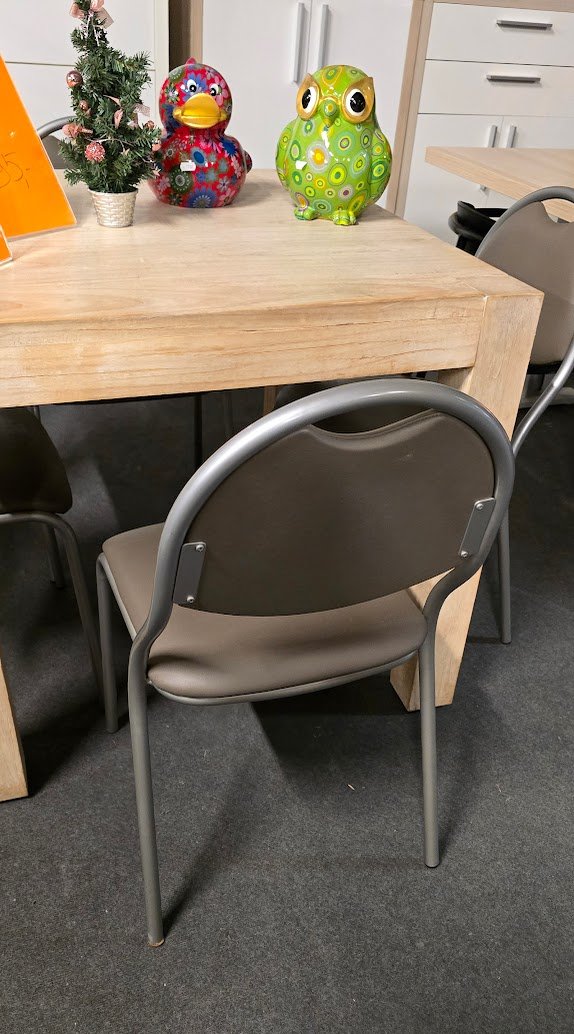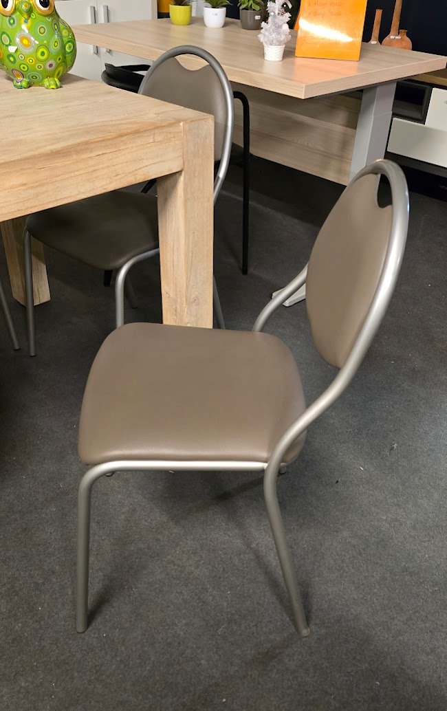 Set van 4 keukenstoelen in goede staat, uitgevoerd in een neutrale taupe kleur met een stevig metalen frame. Deze stoelen hebben een tijdloos en praktisch ontwerp dat gemakkelijk combineert met verschillende keuken- en eettafelstijlen. Dankzij de comfortabele zithoogte en compacte afmetingen zijn ze ideaal voor dagelijks gebruik in keuken of eetruimte.