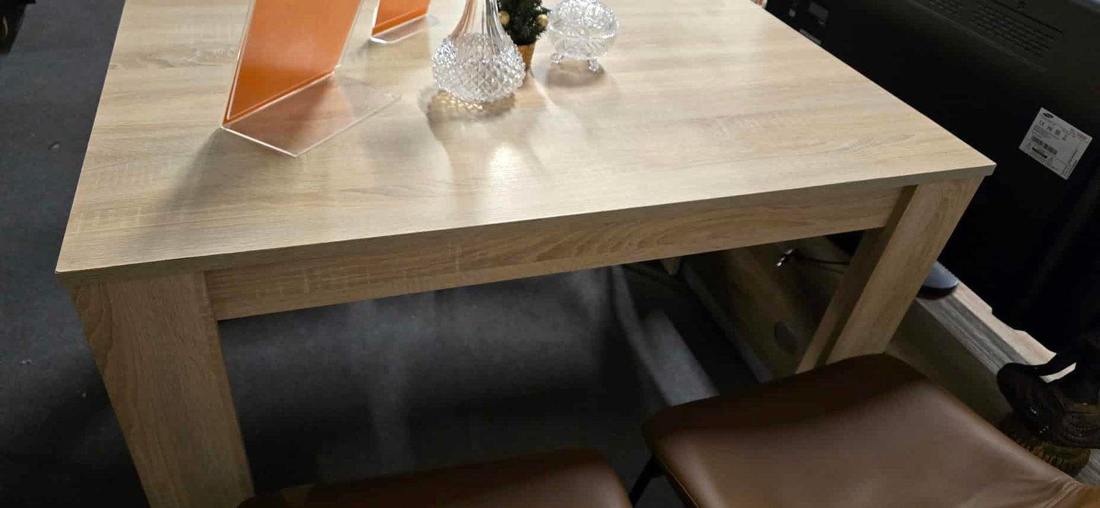 Deze eigentijdse moderne keukentafel heeft een mooie lichte houtstructuur en een strak, rechtlijnig ontwerp. Dankzij het compacte formaat past hij perfect in kleinere keukens, eetruimtes of studio’s.