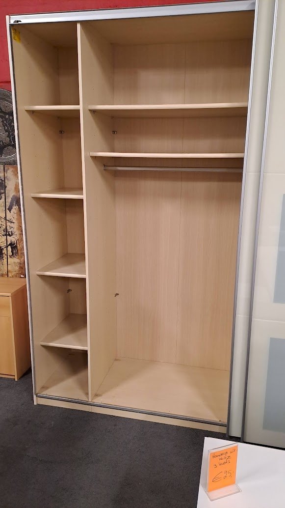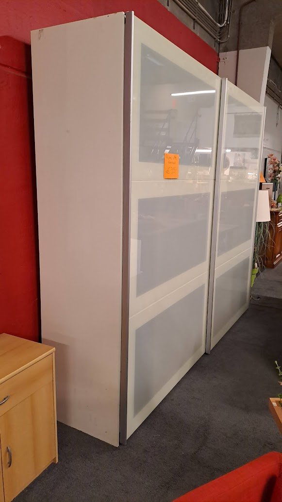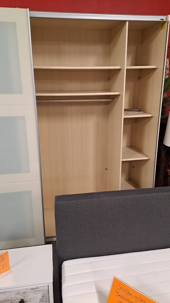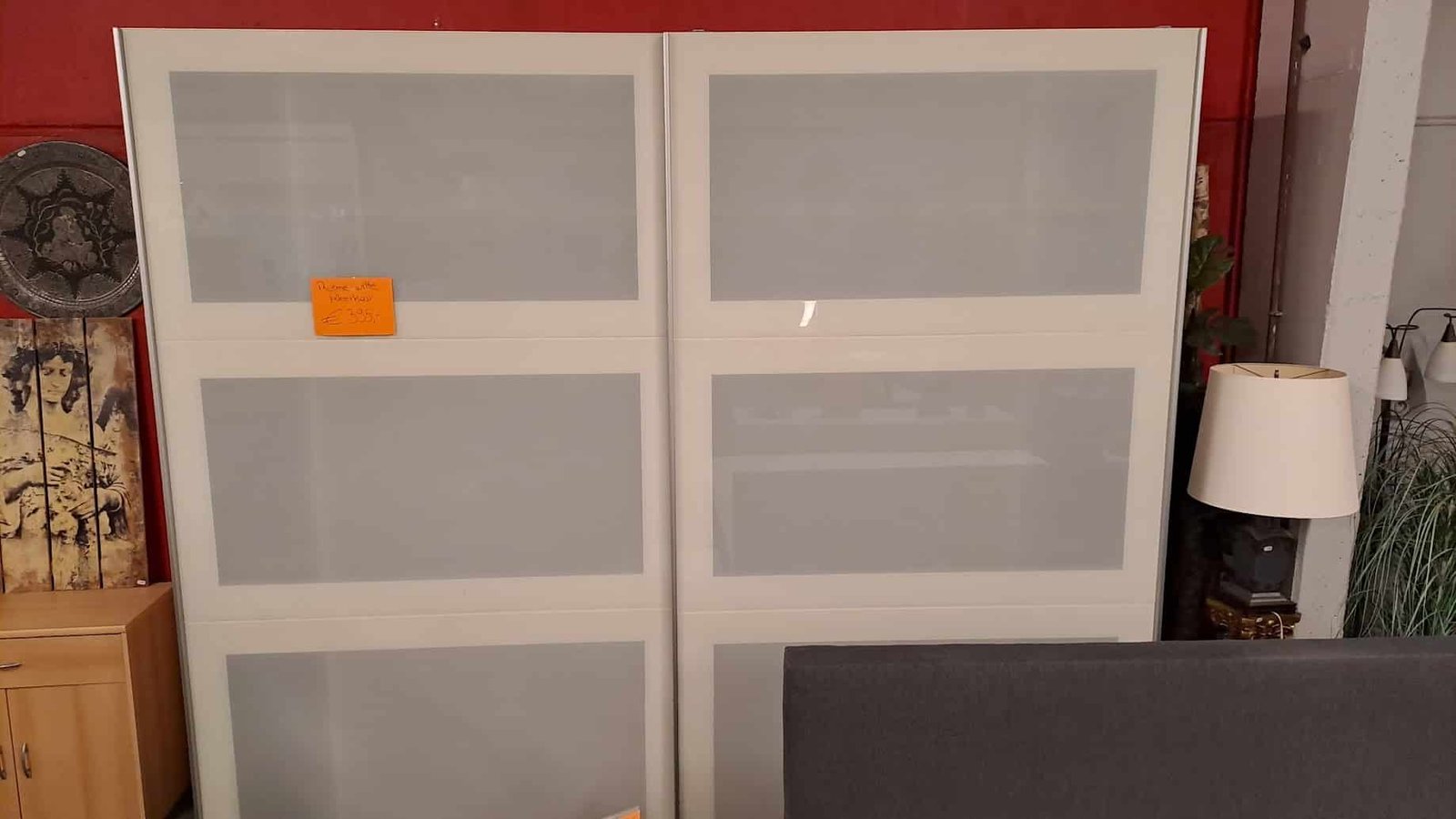Grote, moderne ruime witte kleerkast met schuifdeuren in wit glas. Binnenin voorzien van meerdere legplanken en dubbele hangroede voor extra opbergruimte. De strakke afwerking past perfect in elke slaapkamer.