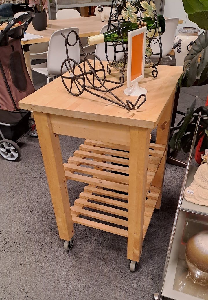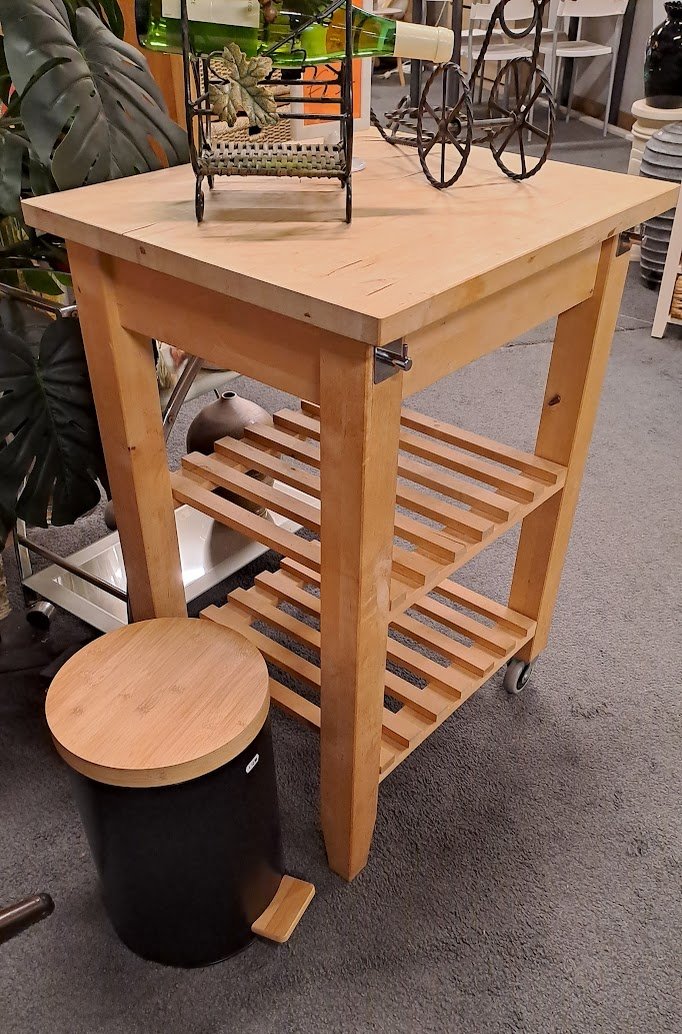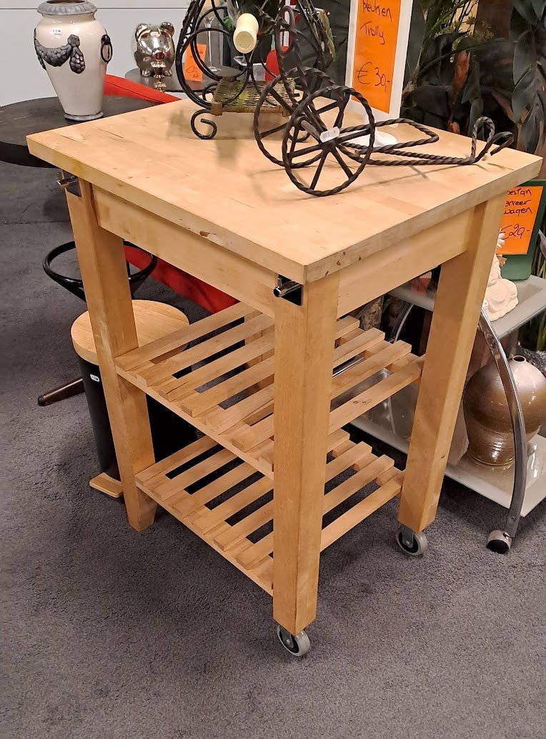 Stevige keukentrolley in massief hout met twee legplanken en wieltjes voor extra gebruiksgemak. Praktisch als extra werkvlak of serveerwagen in de keuken.
