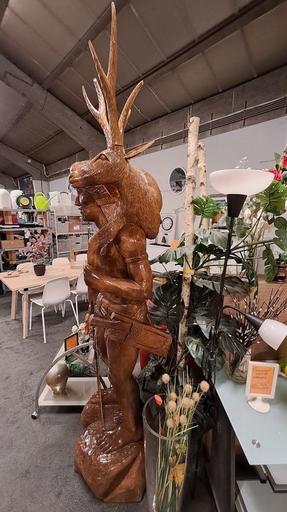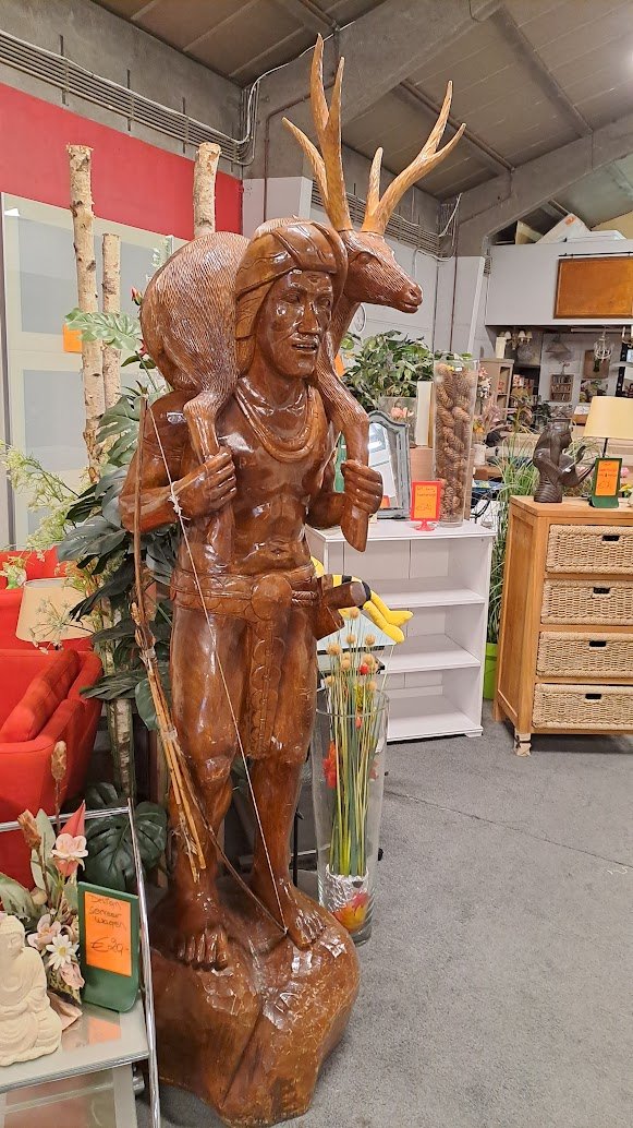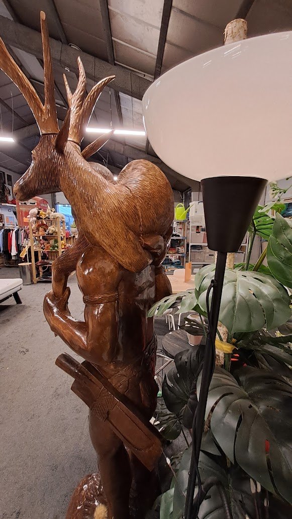 Een indrukwekkend handgesneden levensgrote krijger met hert in massief hout, volledig levensgroot en een echte blikvanger in elke ruimte.
