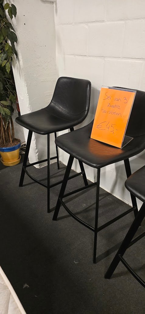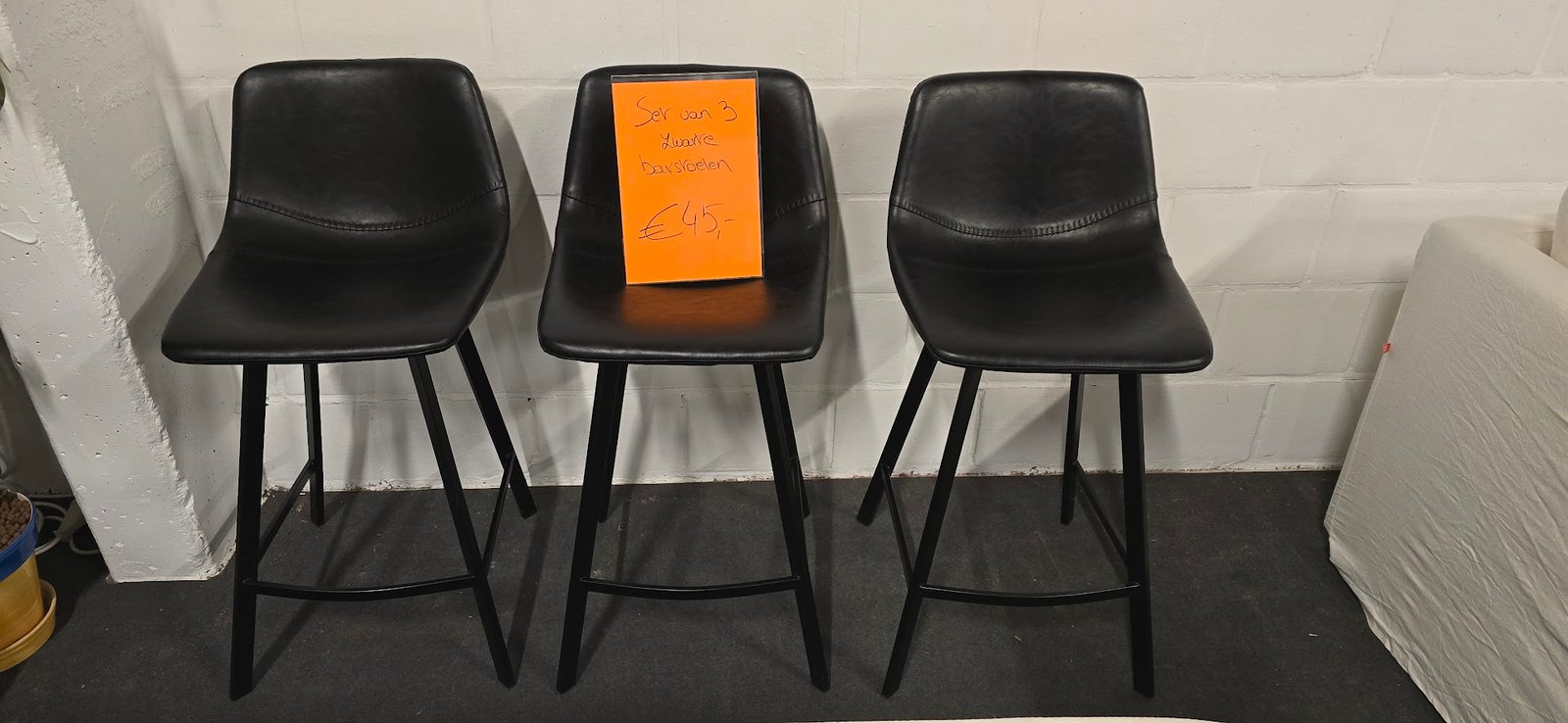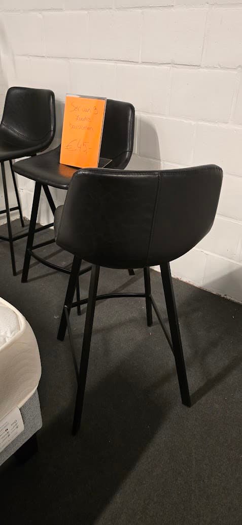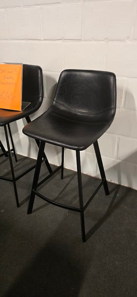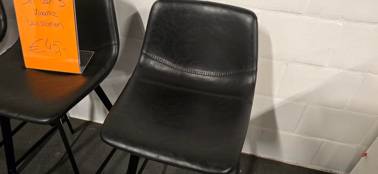 Deze zwarte lederlook barstoelen combineren een strak design met comfortabel zit gemak. Perfect voor aan een kookeiland, bar of hoge tafel.