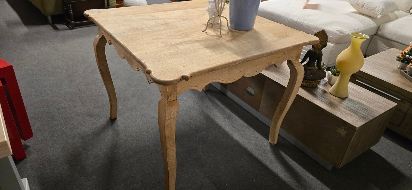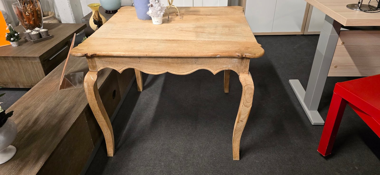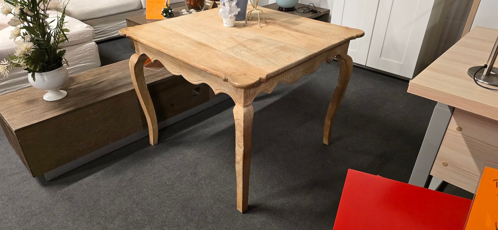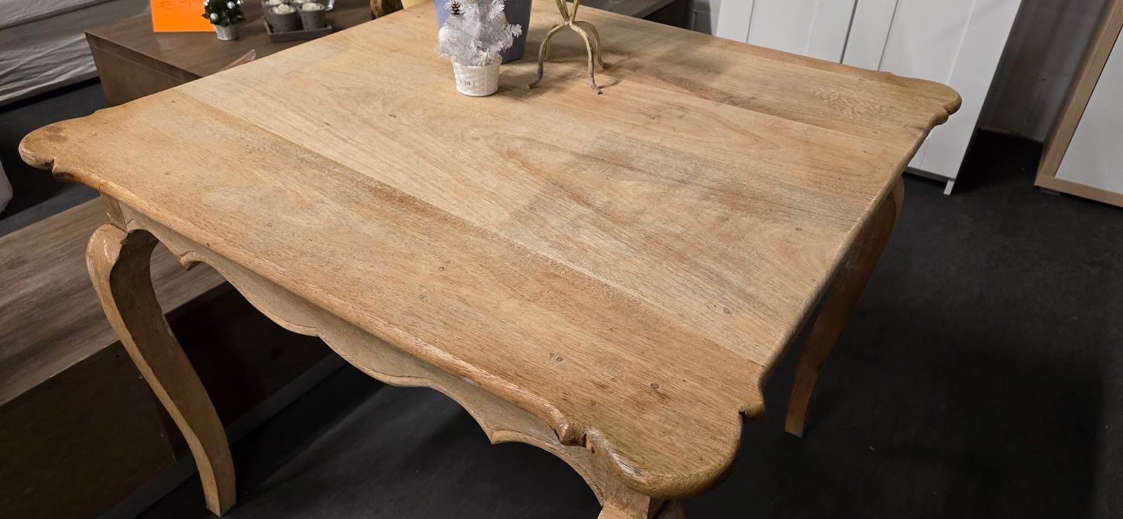 Deze massieve tafel en vierkant model dat gezandstraald werd voor een lichte, moderne en natuurlijke uitstraling. Dankzij het compacte formaat past hij perfect in kleinere eethoeken, keukens of studio’s.