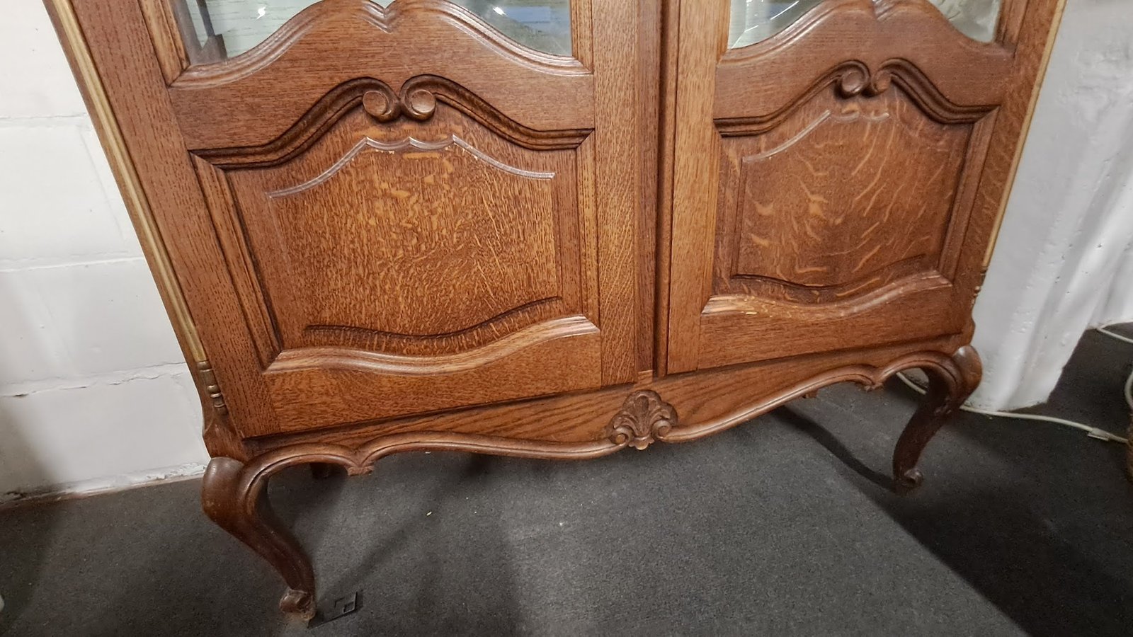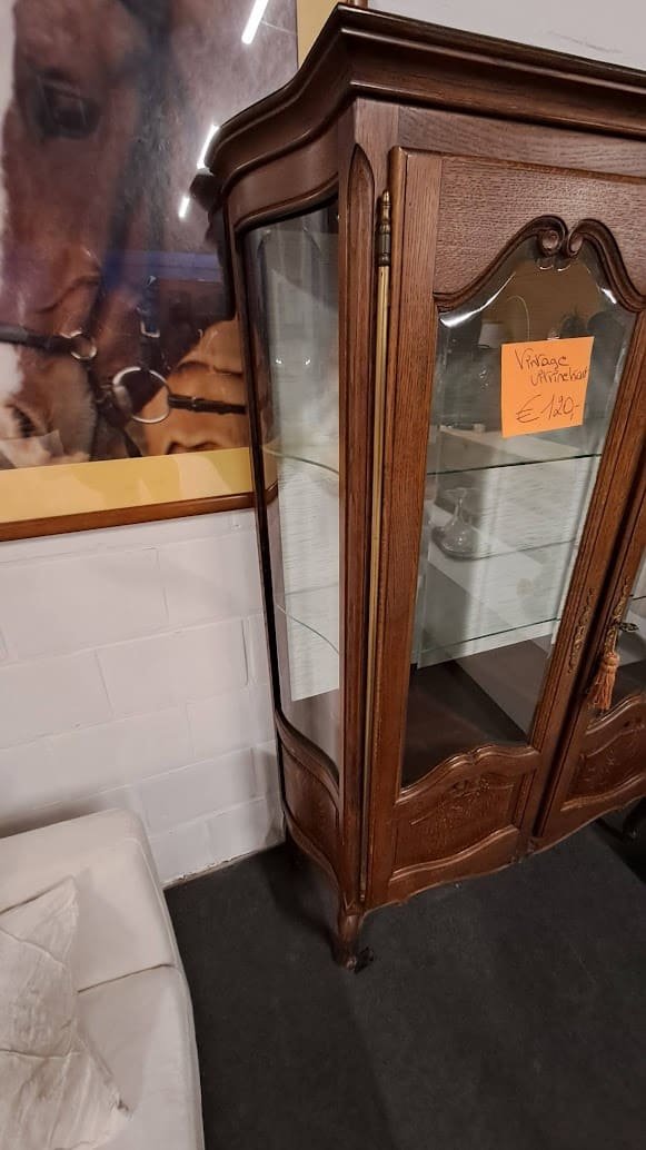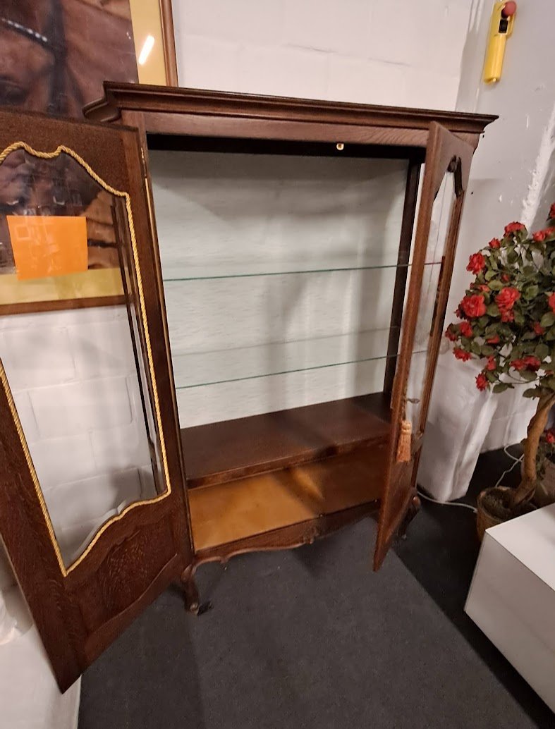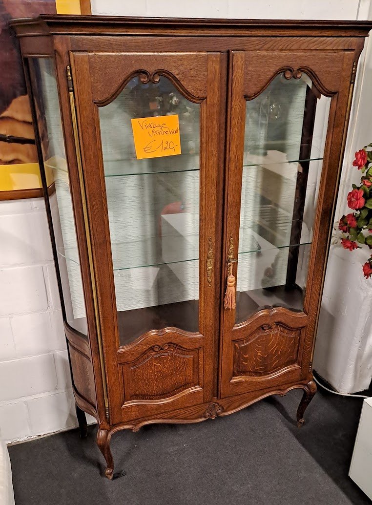 Prachtige vintage vitrinekast in Louis XV-stijl met sierlijke poten en gebogen zijruiten. De kast heeft twee glazen legplanken en een authentieke afwerking met fijne details.
