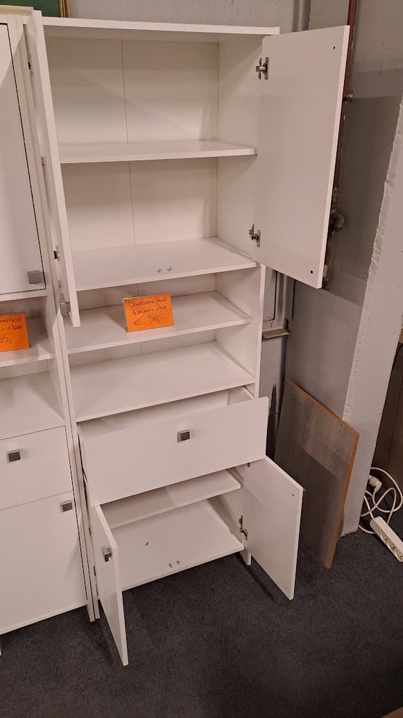 Witte badkamerkast met 4 deuren en lade is een praktische en ruime opbergkast die perfect geschikt is voor badkamer, wasruimte of berging. Dankzij de combinatie van deuren, lade en open vak biedt deze kast veel plaats voor een overzichtelijke indeling.