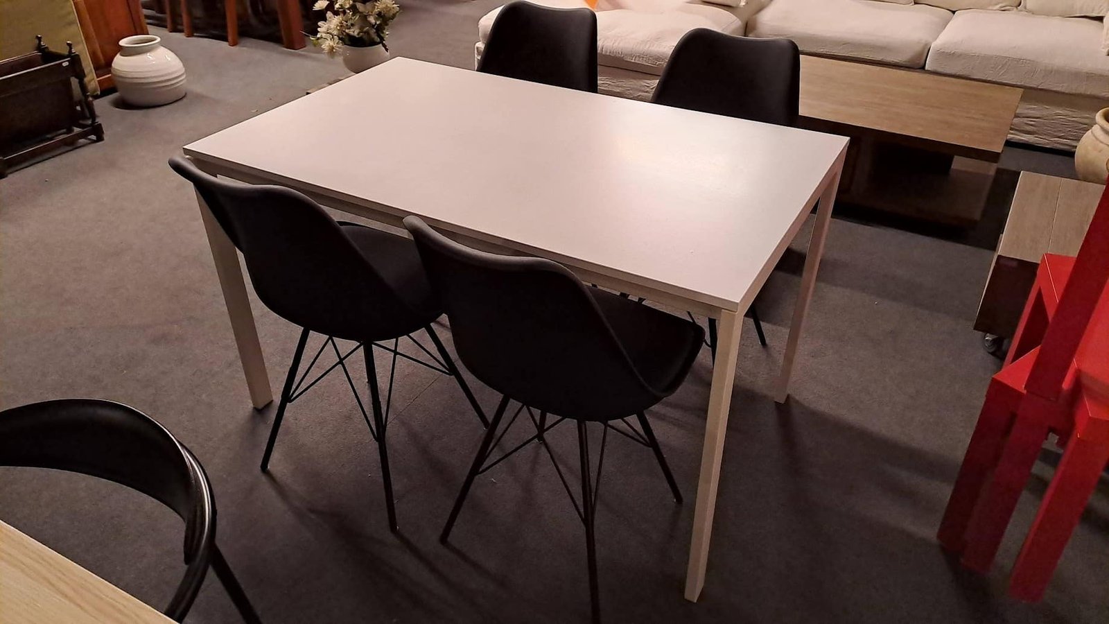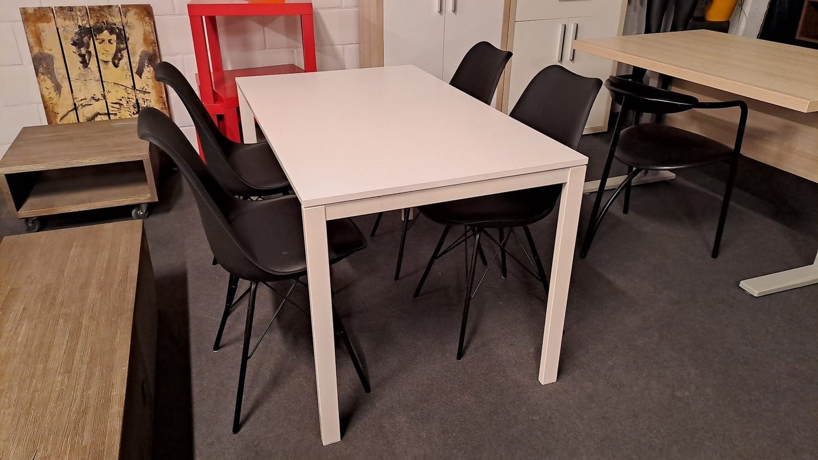 Strakke en moderne witte keukentafel met 4 zwarte stoelen in goede staat.